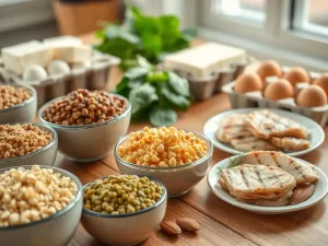 - Podstawowe składniki to: pierś z kurczaka, ryby, jaja, tofu, ciecierzyca i soczewica.